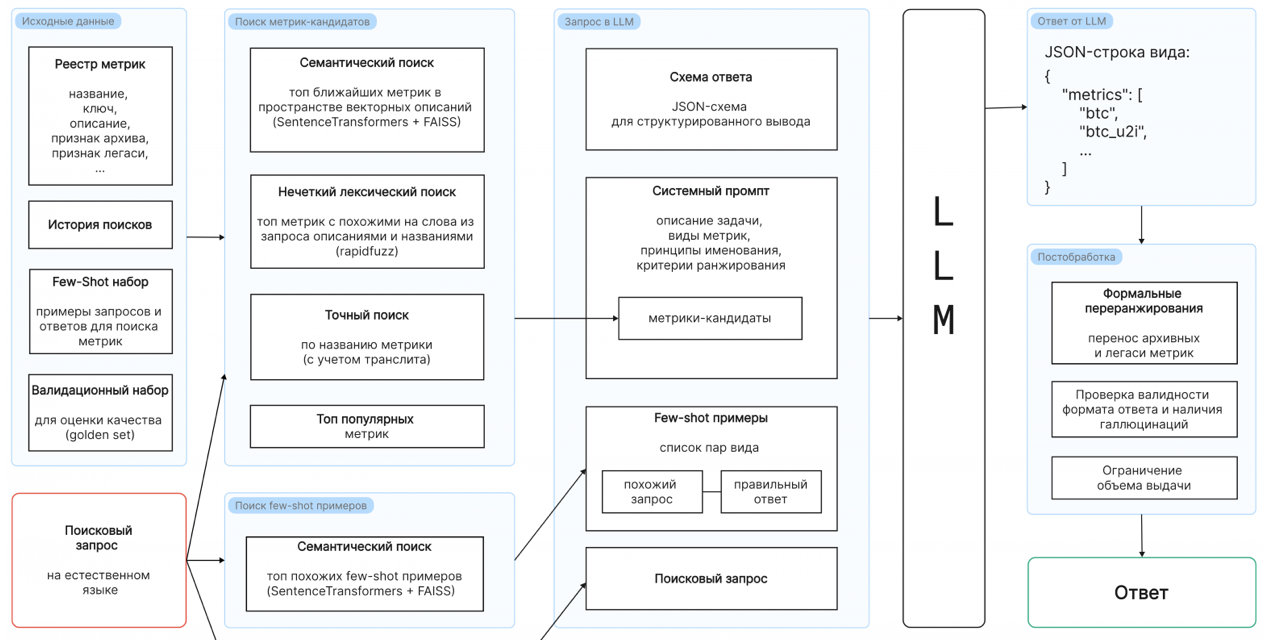 Поскольку метрик много, их полный перечень не получится задать в json-схеме для структурированного вывода. Поэтому необходим отдельный этап поиска метрик-кандидатов, наиболее подходящих входному запросу, которые затем будут подставляться в промпт для LLM в соответствии с RAG-подходом, упомянутым выше.
