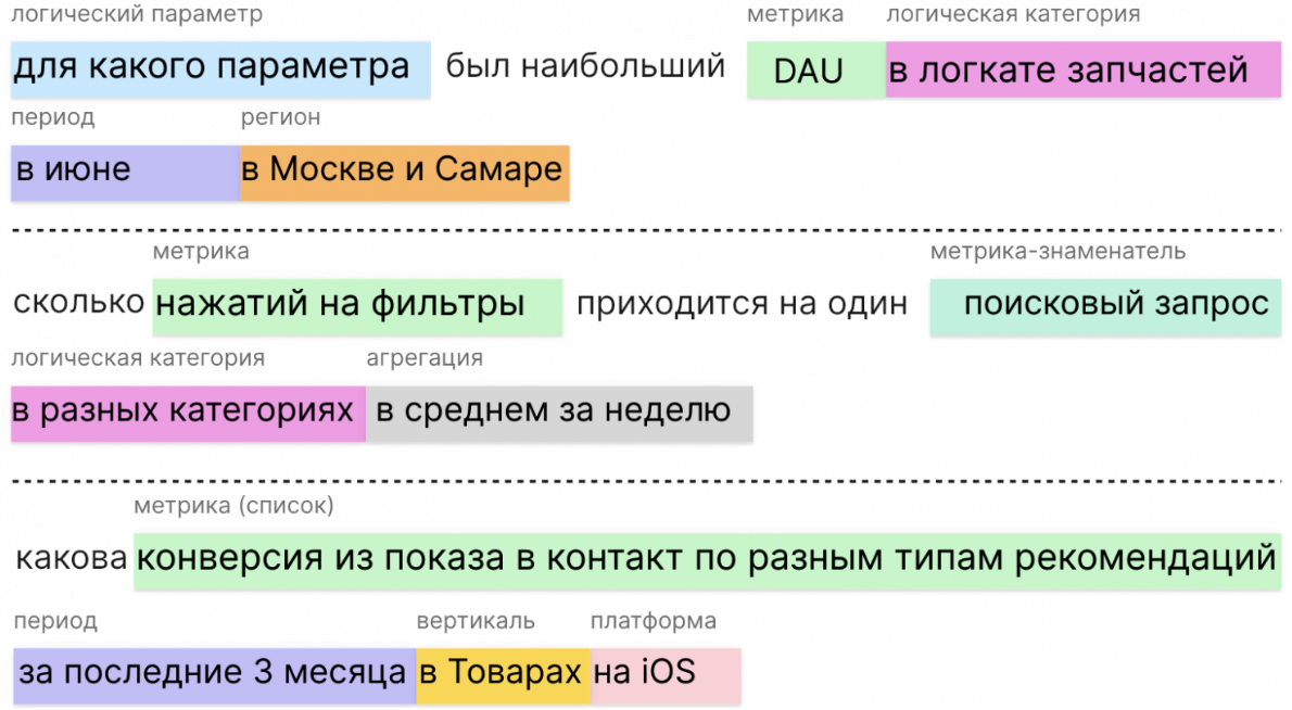 В этом случае ассистент должен определить название метрики («число объявлений»), категорию («Электроника» и ее подкатегории»), временной интервал (первый квартал 2025 года), формат значений метрики (процент изменения относительно прошлой недели), а также формат вывода (таблица). Ассистенту требуется не только правильно выделить слова из запроса, но и поставить им в соответствие реально существующие названия метрик и разрезов, которые могут отличаться от формулировки пользователя. Запрос может содержать жаргонные или транслитерированные названия метрик («баеры с u2i»), аббревиатуры («дау», «arpu»), неточные формулировки разрезов («просмотры в запчастях») — со всем этим ИИ-ассистент должен сопоставить правильное значение.