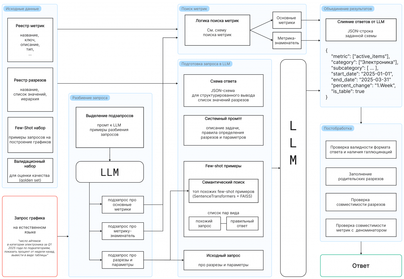 Мы составляем промпт для языковой модели, в который помещаем инструкции о том, что она выполняет роль бизнес-аналитика, и даем описание разрезов и возможных параметров графика. Кроме того, задается строгая схема ответа в формате json с указанием допустимых значений разрезов и параметров. Такой способ структурированного вывода позволяет добиться корректного формата ответов и в некоторых случаях обойтись без явных инструкций. Например, модель успешно справляется с определением интервалов дат и географических регионов уже по одному наличию в json-схеме полей «start_date» или «region» с перечнем вариантов.