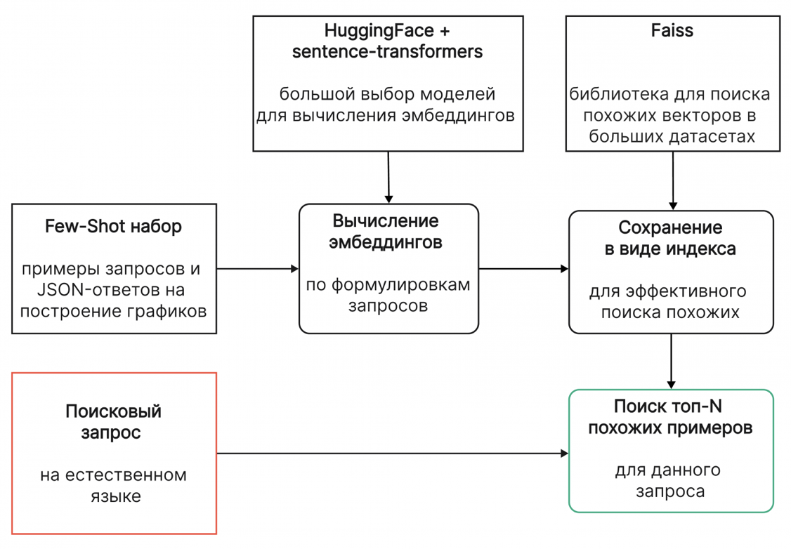 У нас есть отобранное множество пар запросов и правильных ответов, которые можно подавать в LLM. Однако целесообразнее подавать примеры, наиболее похожие на текущий запрос. В этом состоит известный подход RAG, для реализации которого примеры и сам запрос кодируются в виде векторных представлений (эмбеддингов). Для вычисления эмбеддингов используются модели из репозитория Huggingface, обученные на корпусе русских и английских текстов, например, rubert-mini-frida, и библиотека sentence-transformers. Для эффективного расчета расстояний между эмбеддингами удобно пользоваться библиотекой Faiss. Схема этого процесса приведена ниже.
