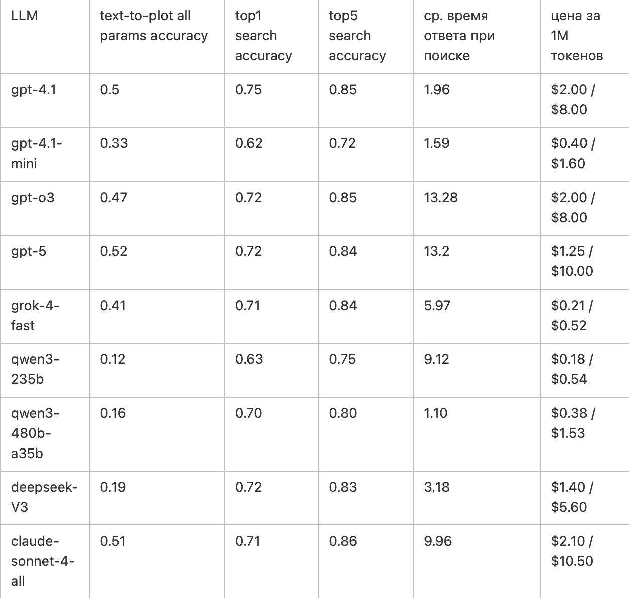 Можно заметить, что модели qwen3-480b и deepseek-V3 показали хорошие результаты в задаче поиска метрик. Однако в задаче обработки запросов на визуализацию их показатели значительно хуже из-за большой вариативности текстов запросов и значений извлекаемых параметров. Критически важным фактором успеха в этой задаче оказалось эффективное использование JSON-схемы структурированного вывода, с которым лучше всего справились gpt-модели, например, gpt-4.1.