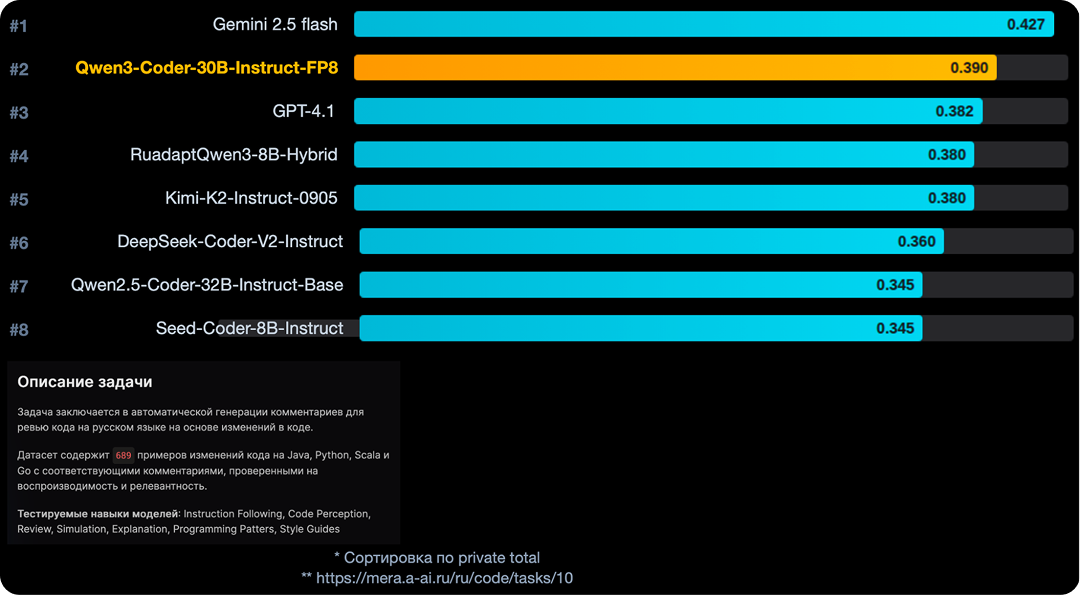 Лидерборд моделей MERA-RuCodeReviewer: мы выбрали Qwen3-Coder-30B-Instruct-FP8 и она занимает второе место