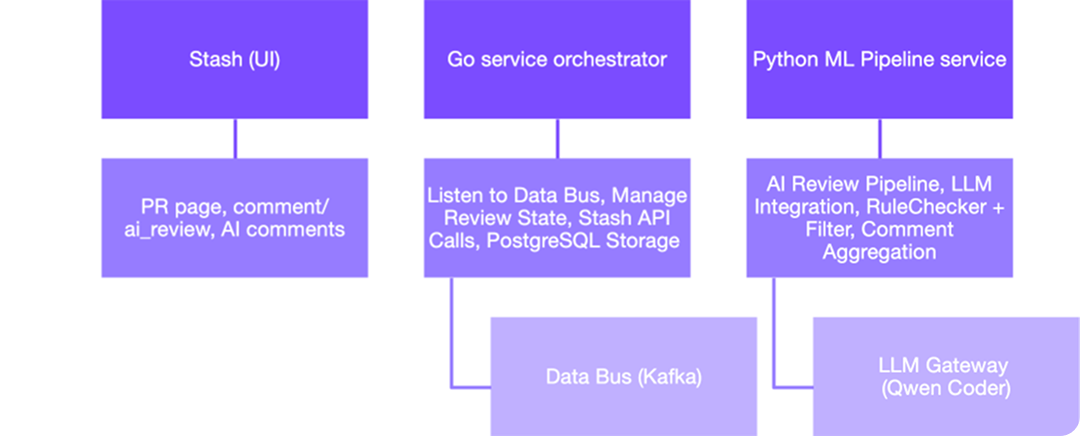 1. Запуск ревью из Stash. Пользователь оставляет комментарий ai_review, после чего генерируется Data Bus событие. Go-сервис получает его и парсит команду.