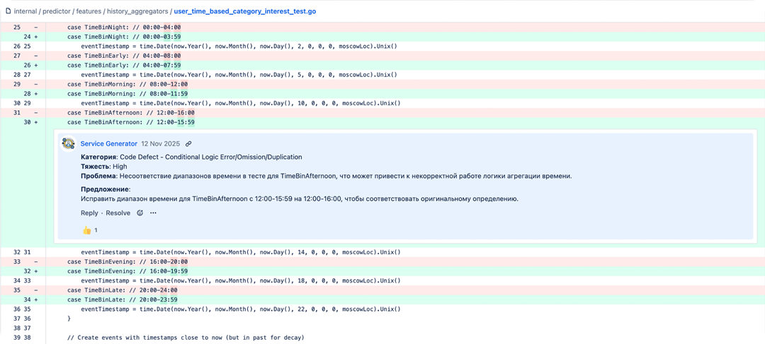 Пример генерации. В одном из пул-реквестов неправильно указали диапазон времени — не по московскому времени. Модель предложила исправить диапазон, и разработчик поставил лайк