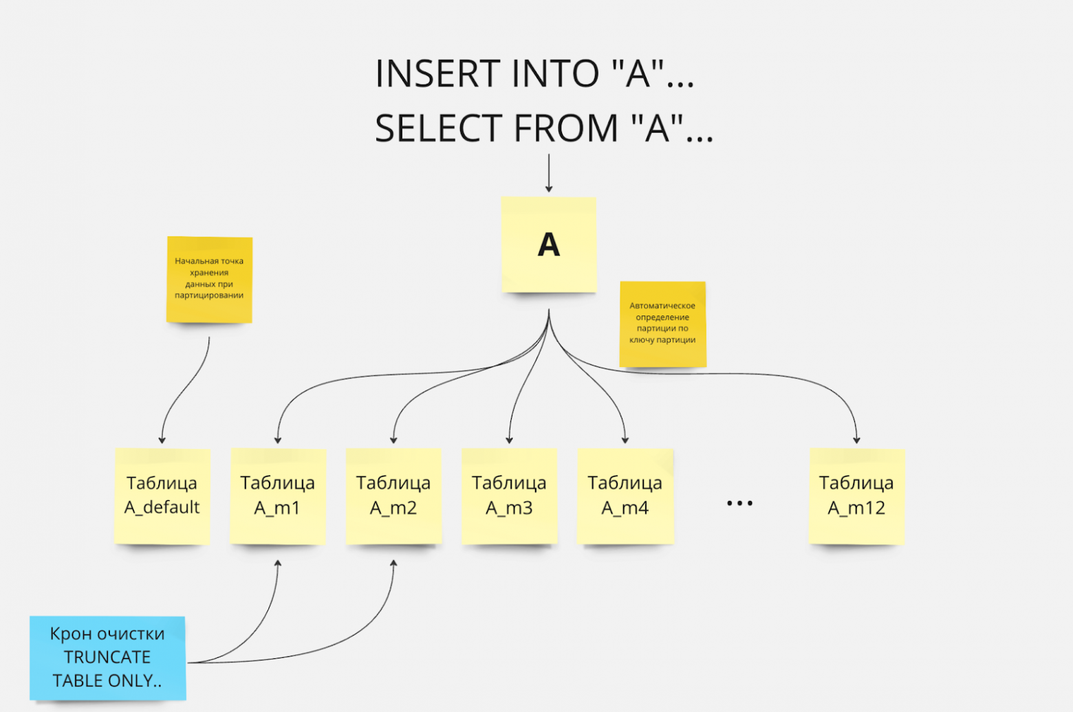 После того, как в секциях накоплен необходимый срез данных для работы сервиса, очищаем оператором TRUNCATE_ONLY секцию A_default и создаём регламентную задачу (cron), который очищает секции с устаревшими данными.