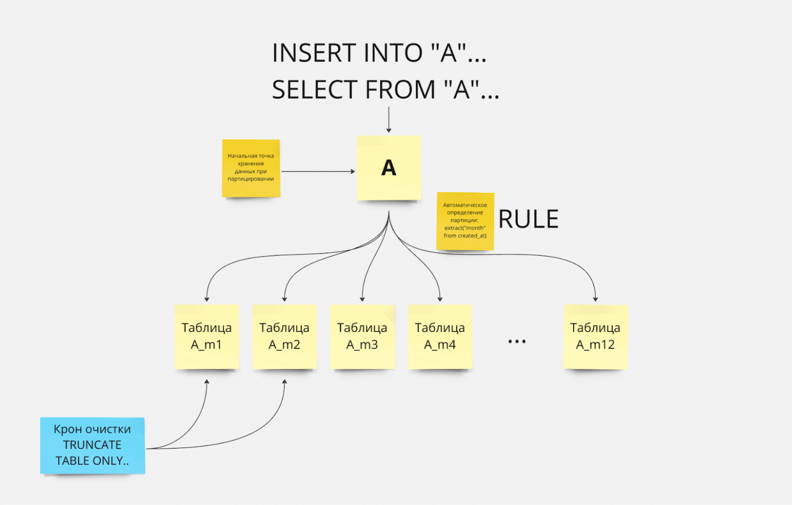После того, как отрезали старые данные, важно не забыть автоматизировать процесс очистки ненужных партиций. В данном случае потребовалось разделить таблицу на 12 партиций, каждая из которых накапливает данные ровно один календарный месяц. Количество партиций зависит от нужной вам гранулярности.